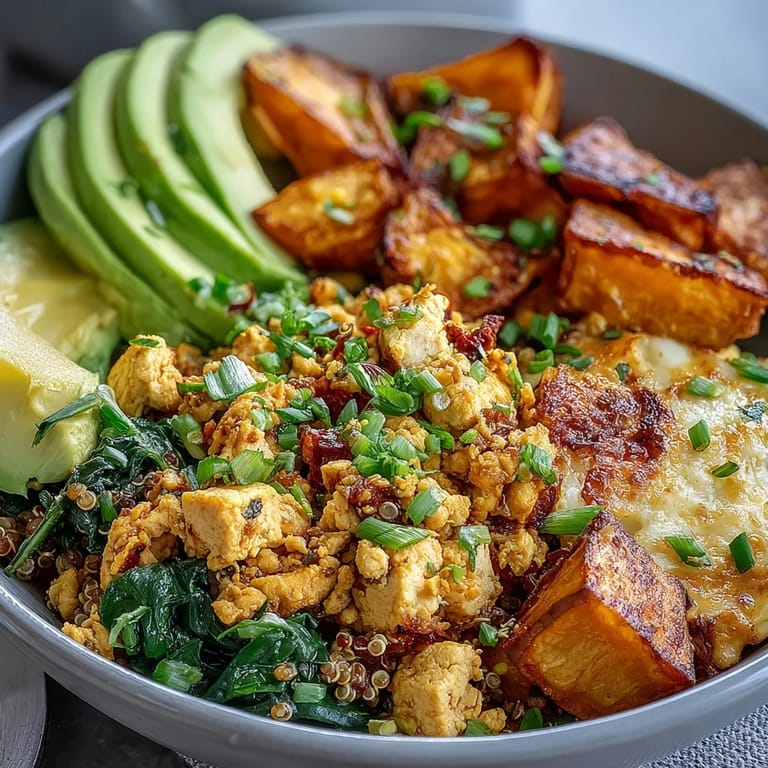 Save to Pinterest There's something about the smell of turmeric hitting a hot skillet on a quiet morning that just shifts the whole day's energy. I stumbled onto this bowl during a phase where I was trying to prove to myself that vegan breakfast could actually be exciting, not just a sad compromise of what I used to eat. The first time I layered everything together, I realized how each component—the creamy avocado, the nutty quinoa, those crispy sweet potato edges—had its own moment to shine, but somehow they made each other better. It became my go-to when I wanted to feel genuinely nourished rather than just fed.